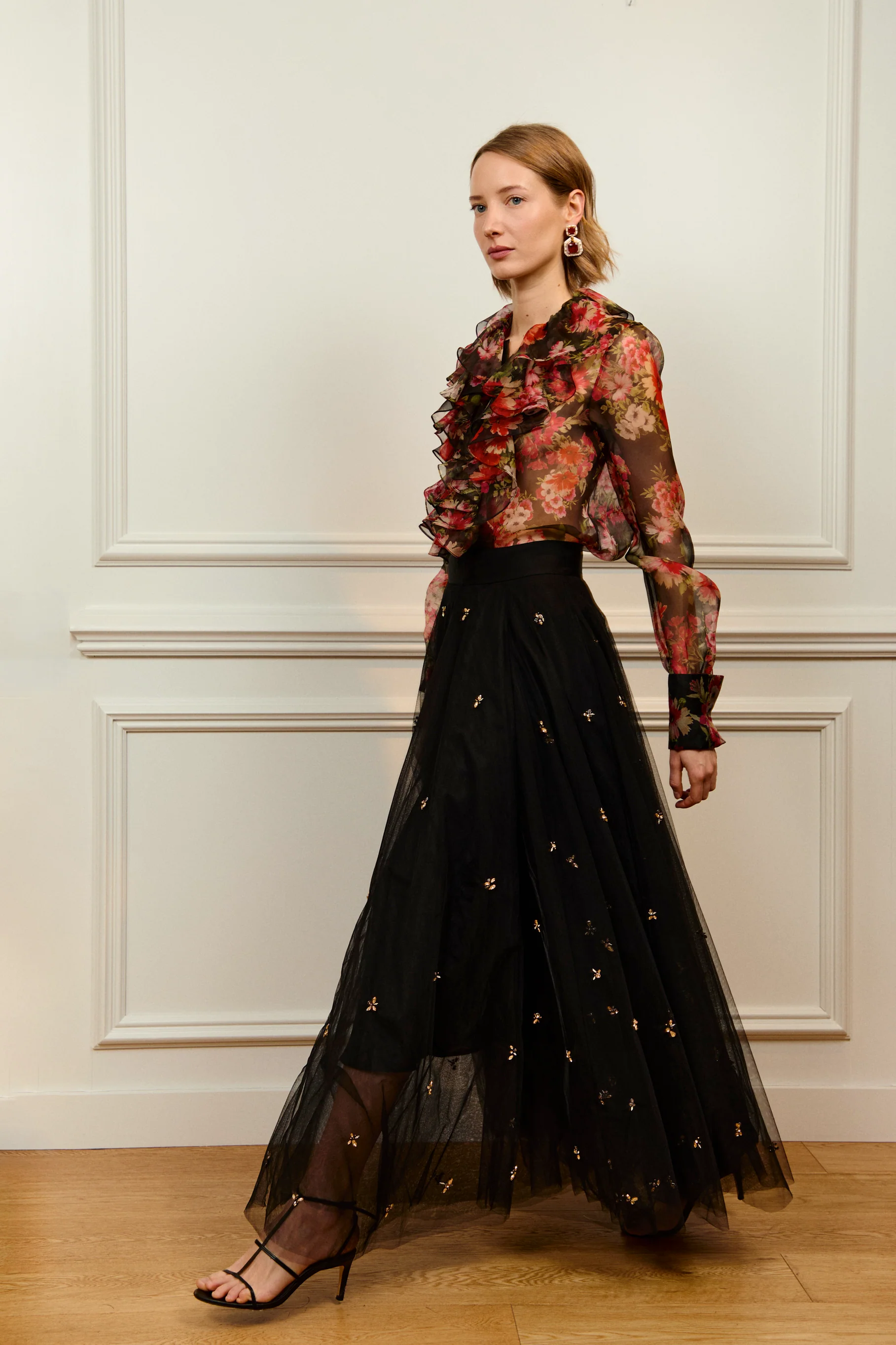 Blusa confeccionada en delicado tejido semitransparente con estampado floral en tonos rojos, rosados y verdes sobre fondo oscuro. Destaca por su romántico cuello con volantes en cascada y detalle frontal fruncido que aporta volumen y sofisticación. Las mangas largas ligeramente abullonadas, terminadas en puño ajustado, realzan su silueta femenina y elegante.