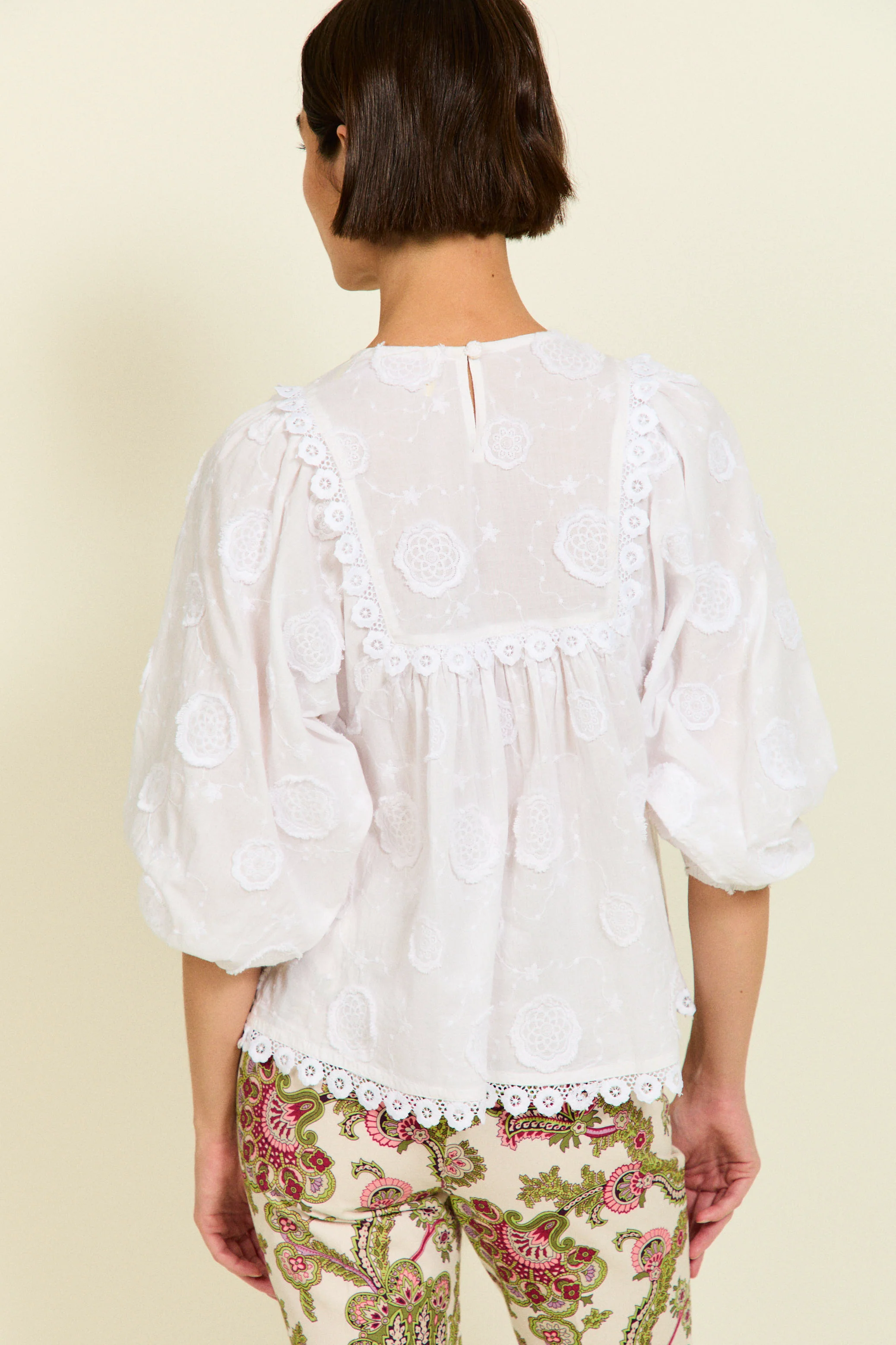 Blusa blanca de inspiración romántica, confeccionada en tejido ligero de algodón, con delicado bordado floral en relieve. Presenta corte amplio y fluido con canesú delantero decorado con puntillas y pequeños botones, que aportan un aire vintage y femenino. Las mangas largas con ligero volumen y puño fruncido refuerzan su estilo bohemio, mientras que el bajo acabado en encaje añade un toque artesanal y elegante.