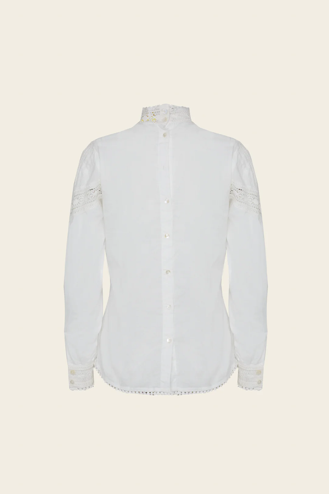 El diseño destaca por su cuello alto y estructurado, así como por el panel frontal adornado con una combinación de botones blancos y botones negros bordados a mano con un delicado motivo floral. Las mangas largas ligeramente abullonadas acentúan el estilo romántico, mientras que el encaje en los hombros y brazos añade un sutil toque bohemio.