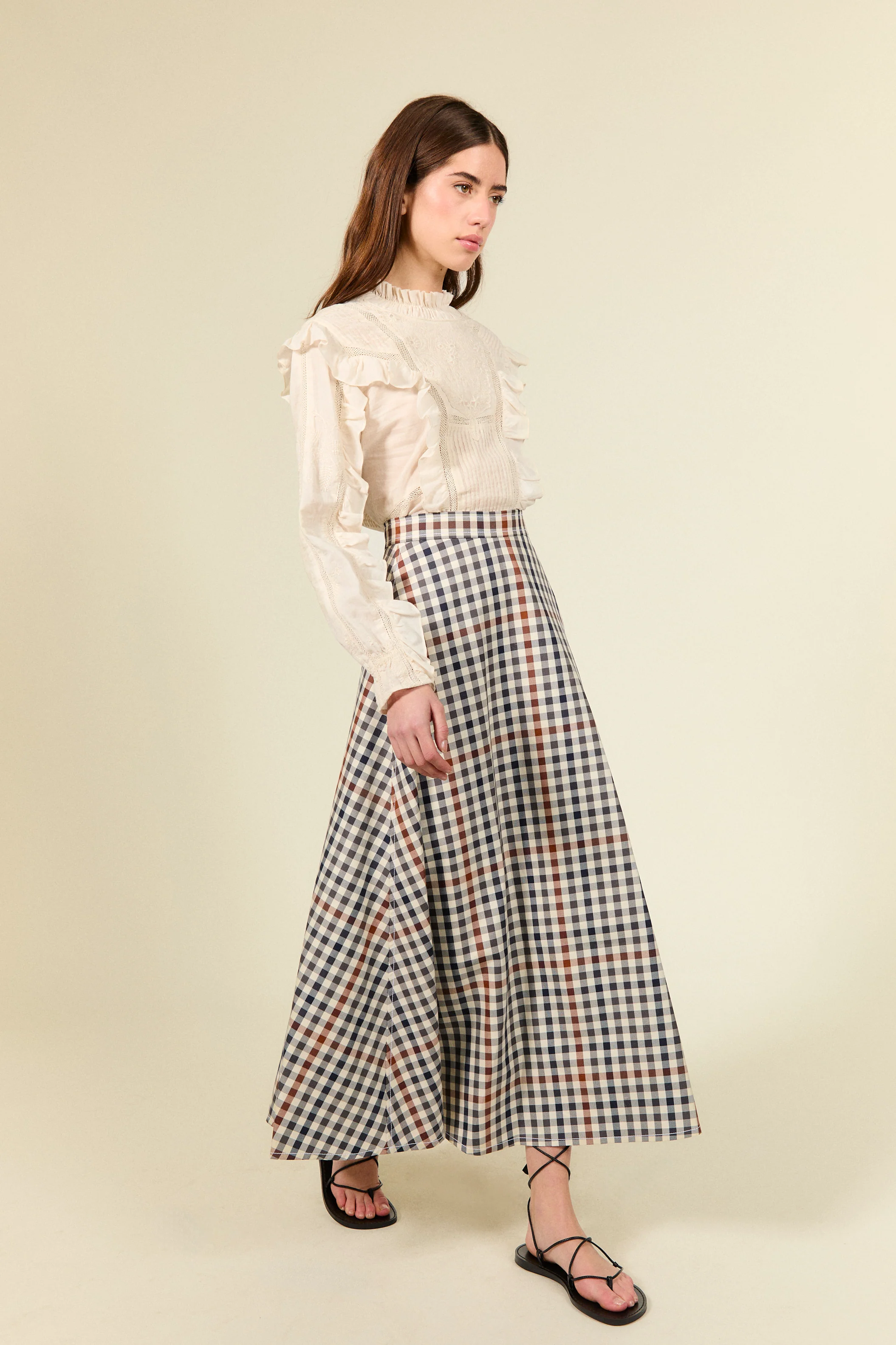 Elegante y atemporal, la falda Mel presenta una silueta fluida y femenina con un diseño de inspiración clásica. Su estampado de cuadros en tonos neutros aporta sofisticación y versatilidad, mientras que su corte favorecedor estiliza la figura con una caída natural y refinada.