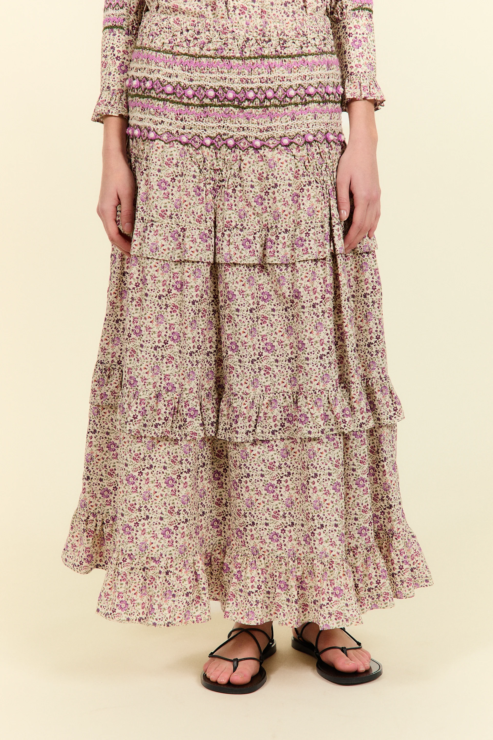 Falda larga confeccionada en tejido ligero y fluido de algodón. Presenta estampado floral en tonos malva y verde sobre fondo claro, con detalle de cenefa decorativa en la cintura. Diseño de tiro alto y falda con volantes en distintos niveles, que aportan movimiento y una caída elegante.