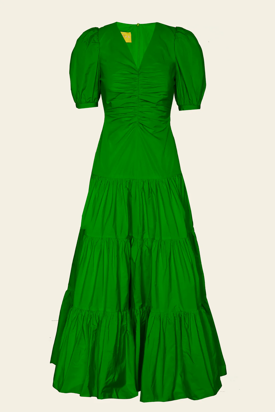 El vestido Naia en color verde es un diseño largo de manga corta con una maravillosa falda de vuelo. Está confeccionado en tafetán, un tejido con estructura, suave y con tacto sedoso. Cuenta con favorecedor escote en V, un cuerpo fruncido, unas mangas ligeramente abullonadas y volantes que brindan movimiento y volumen.