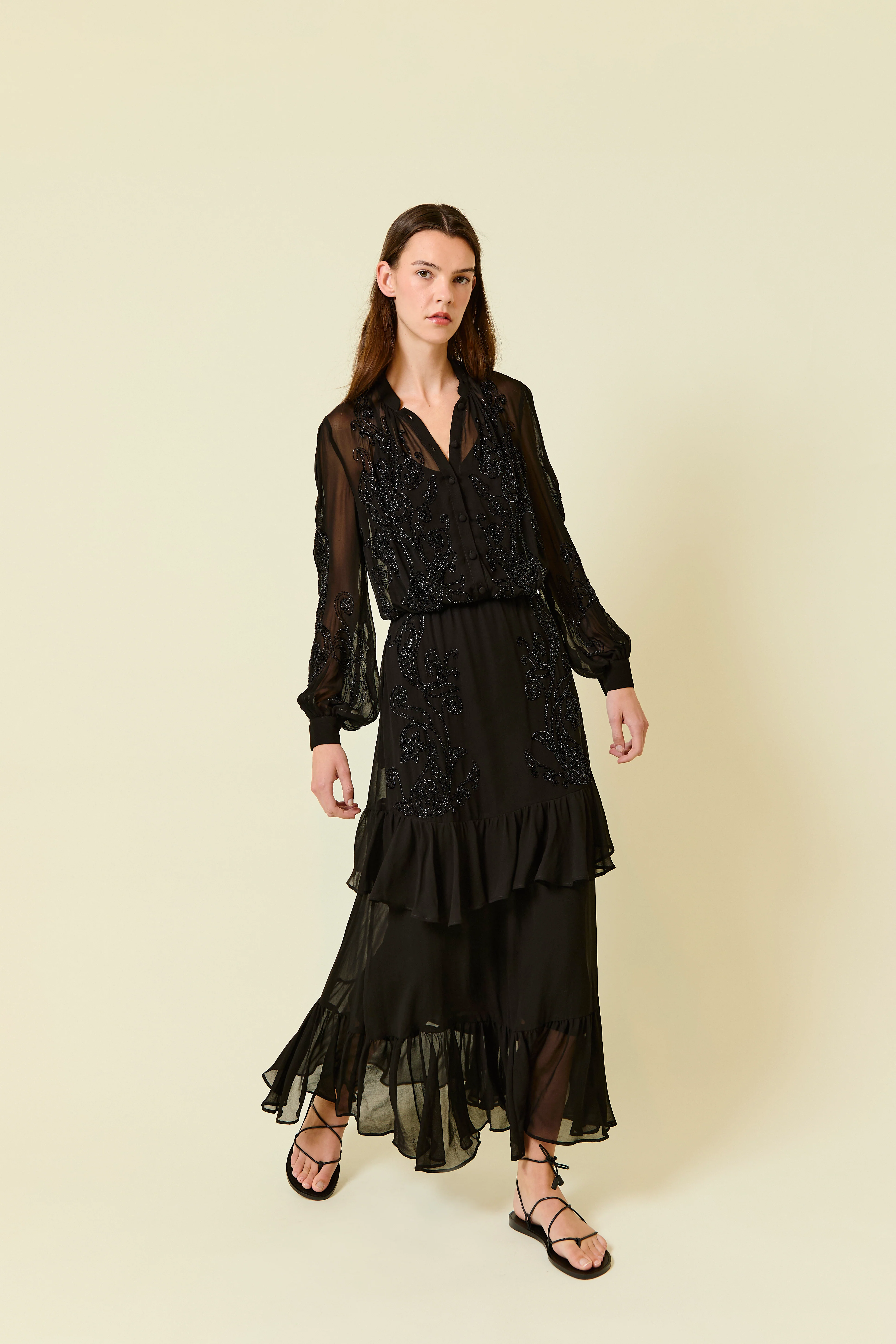 Elegancia atemporal con un toque de romanticismo. El vestido Ariadna está confeccionado en 100% viscosa, lo que le otorga una caída fluida y un tacto suave y ligero. Su diseño en color negro incorpora un delicado bordado artesanal en plata que añade textura y sofisticación.