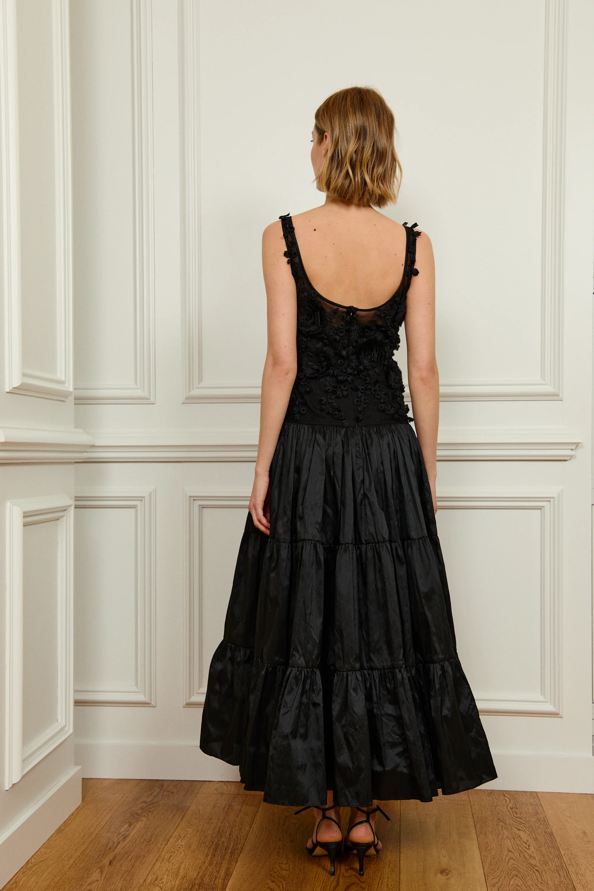 Vestido midi en tono negro que combina delicadeza y carácter en una silueta femenina y sofisticada. El cuerpo destaca por su espectacular bordado floral tridimensional con aplicaciones en relieve, creando un efecto artesanal lleno de textura y profundidad. La falda de corte amplio con volantes aporta movimiento y ligereza, mientras que los tirantes finos y el escote redondo realzan la figura con sutileza.