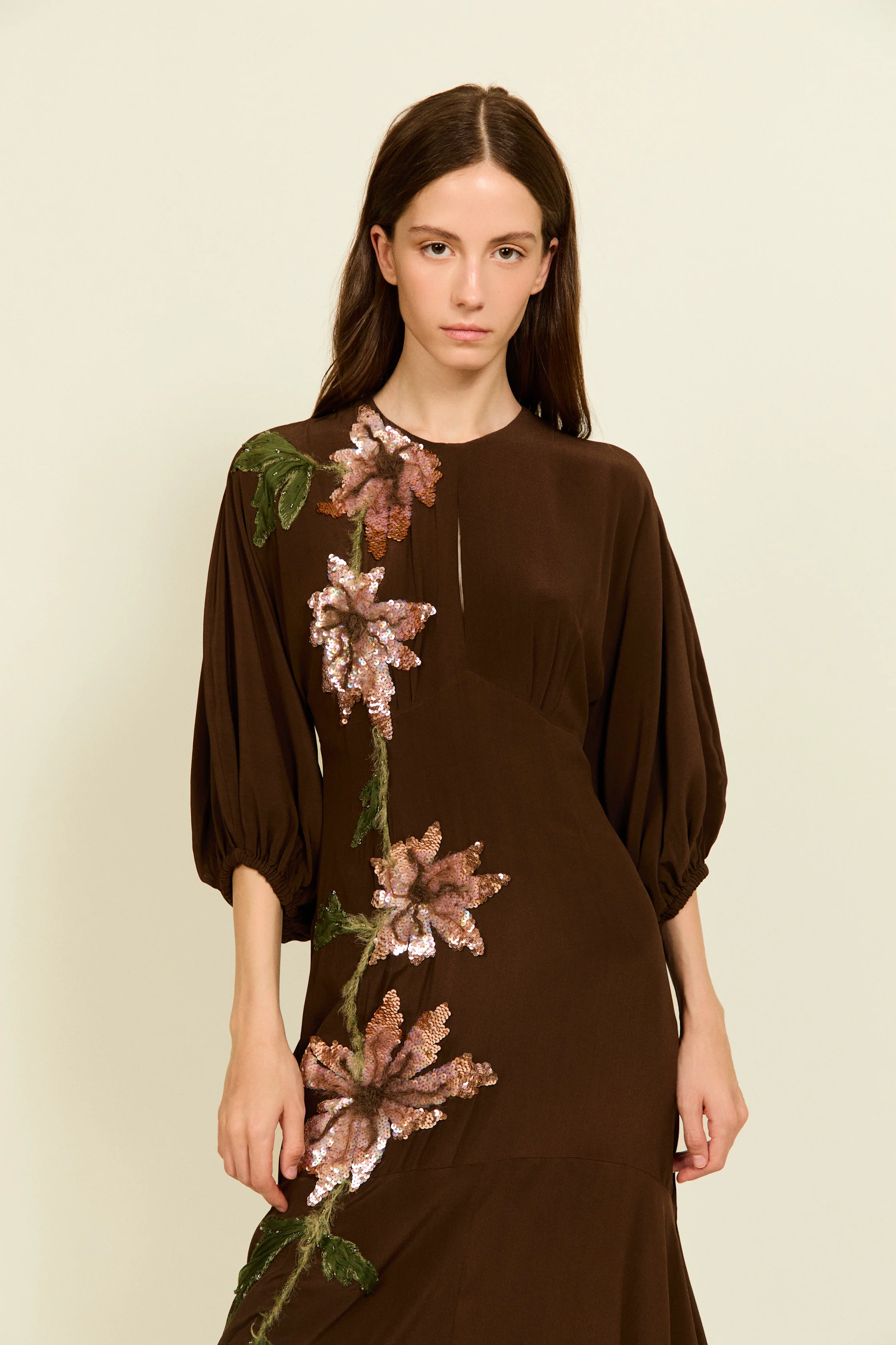 Este vestido bordado con lentejuelas es una pieza exquisita diseñada para la sofisticación. Confeccionado en un tejido marrón profundo, destaca por sus grandes motivos florales adornados con lentejuelas en tonos rosas suaves y bordados verdes, que forman un llamativo diseño vertical en la parte frontal. Su silueta relajada, el cuello redondo y las mangas abullonadas tres cuartos combinan comodidad con elegancia. Un vestido único, perfecto para ocasiones de noche y eventos especiales.