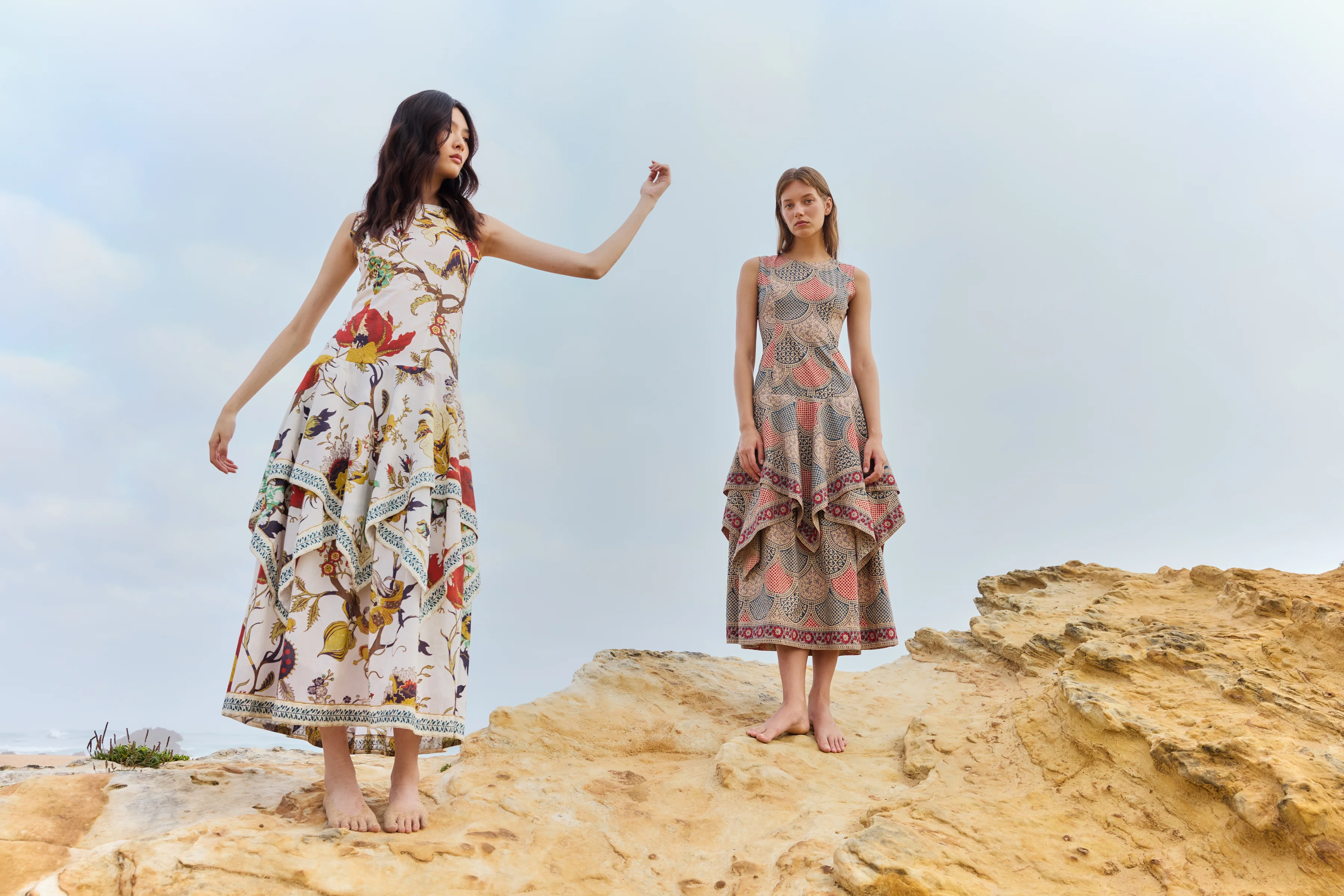 Vestido largo sin mangas confeccionado en tejido ligero de algodón, con base blanca y un vibrante estampado floral de inspiración vintage en tonos rojo, turquesa y mostaza. El diseño presenta un escote redondeado y un cuerpo entallado que estiliza la silueta, dando paso a una falda amplia con caída fluida. El detalle protagonista es su bajo asimétrico con volantes superpuestos y acabados con cenefa decorativa, que aporta movimiento y un aire romántico al conjunto.