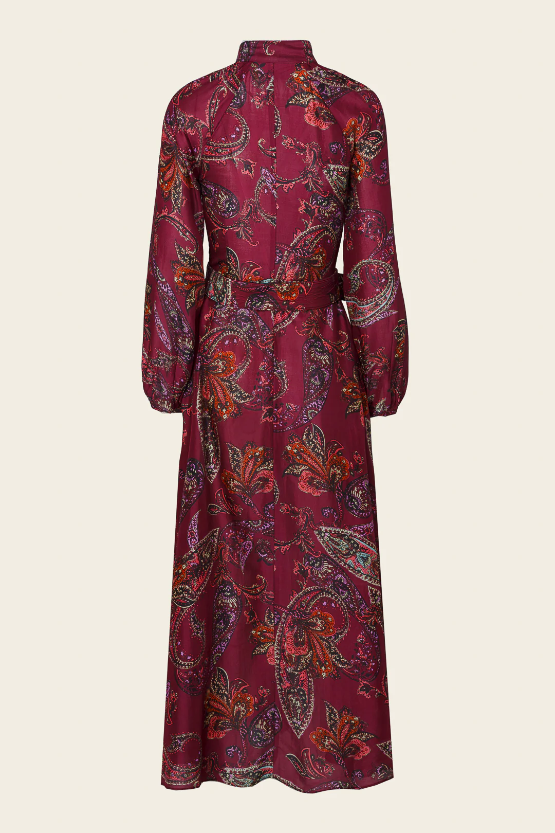 Vestido largo camisero en tono burdeos con estampado paisley en matices rojizos, violetas y anaranjados. Con cuello mao y manga larga ligeramente abullonada, presenta cierre frontal abotonado y cinturón del mismo tejido con espectacular hebilla floral dorada que realza la silueta.