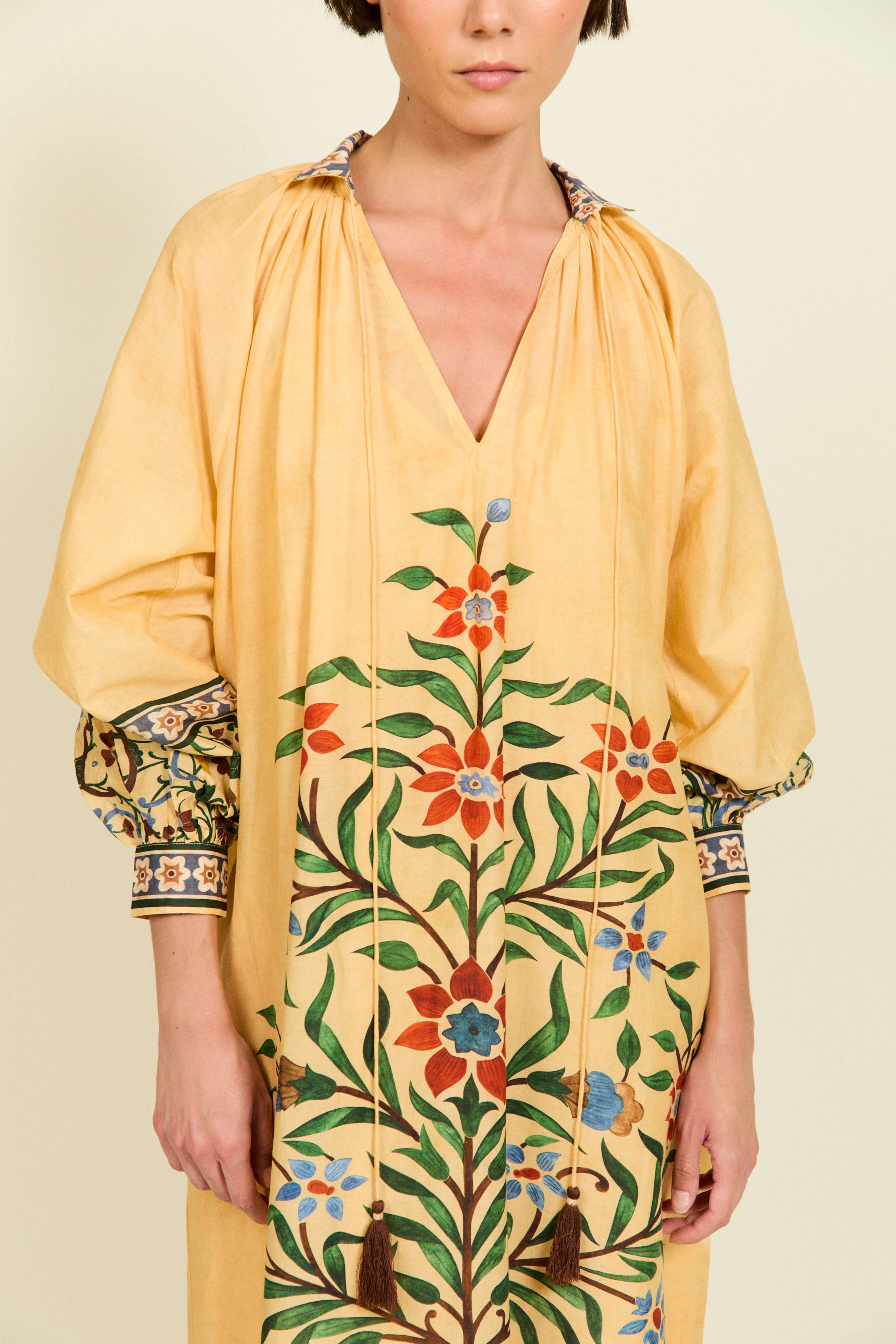 Vestido largo fluido en tono mostaza con delicado estampado floral en contraste verde, azul y teja. Presenta escote en pico con ligera frunce en el cuello y manga larga con detalle estampado en los puños. El diseño se completa con motivo central botánico y volante en el bajo con cenefa decorativa. Una pieza ligera y sofisticada, ideal para un look relajado con esencia bohemia.