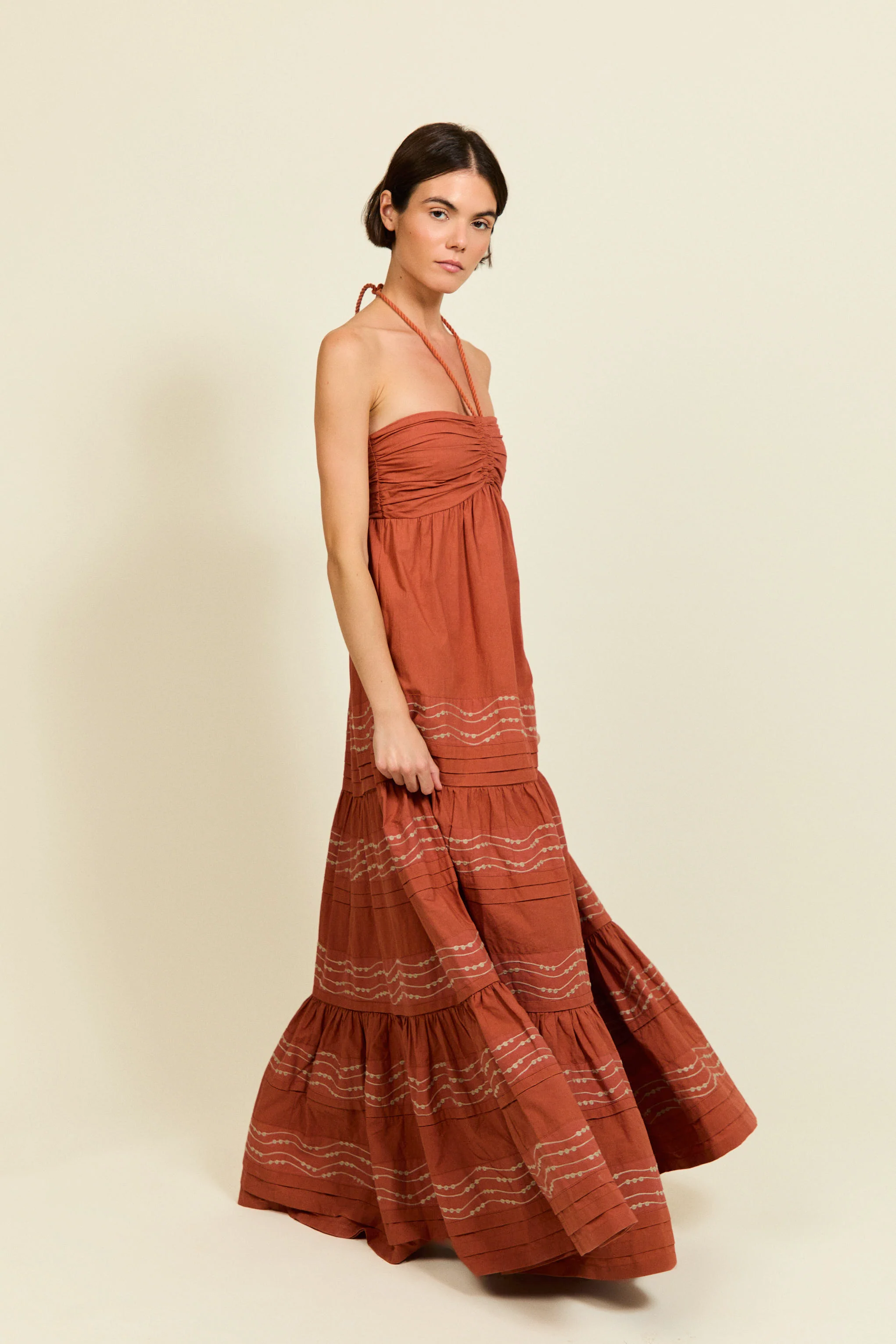 Vestido largo de inspiración bohemia confeccionado en tejido ligero de algodón en tono teja. Presenta escote halter con detalle fruncido en el pecho y tirantes finos que se anudan al cuello, realzando los hombros con un aire femenino y veraniego. La falda amplia se estructura en paneles con delicados bordados horizontales y volantes fruncidos que aportan movimiento y textura.