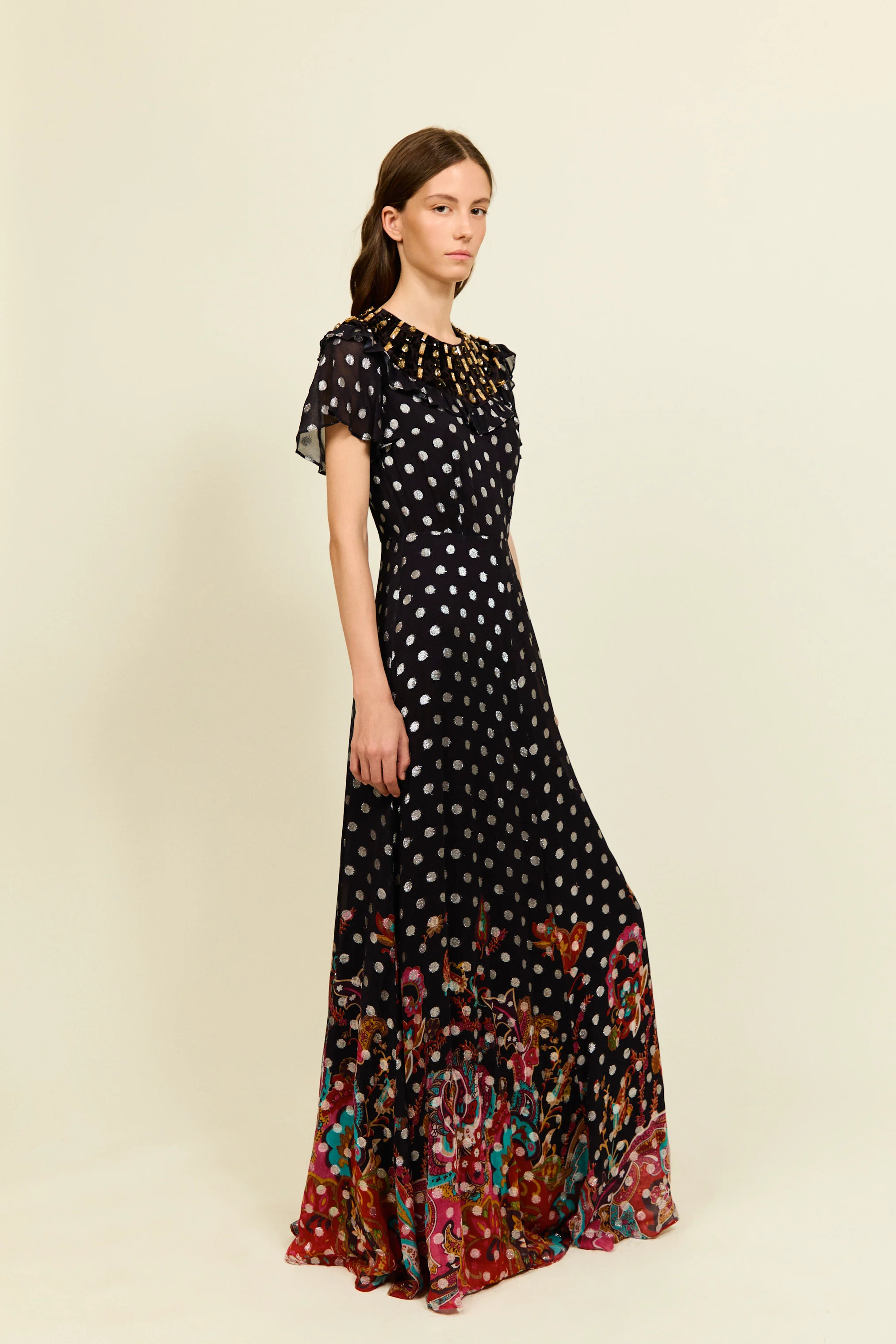 Vestido largo y fluido en color negro, decorado con lunares metálicos plateados en todo el diseño. El bajo presenta un llamativo estampado paisley en tonos rojos, turquesa, naranjas y rosas, que crea un contraste vibrante con el resto de la prenda. El vestido cuenta con mangas cortas de gasa y un detalle de volante en el escote. Su rasgo más distintivo es el cuello de terciopelo negro adornado con grandes cuentas doradas, que aportan un toque dramático y majestuoso. Una combinación única de estampados y detalles, ideal para destacar en eventos de noche o en ocasiones especiales.