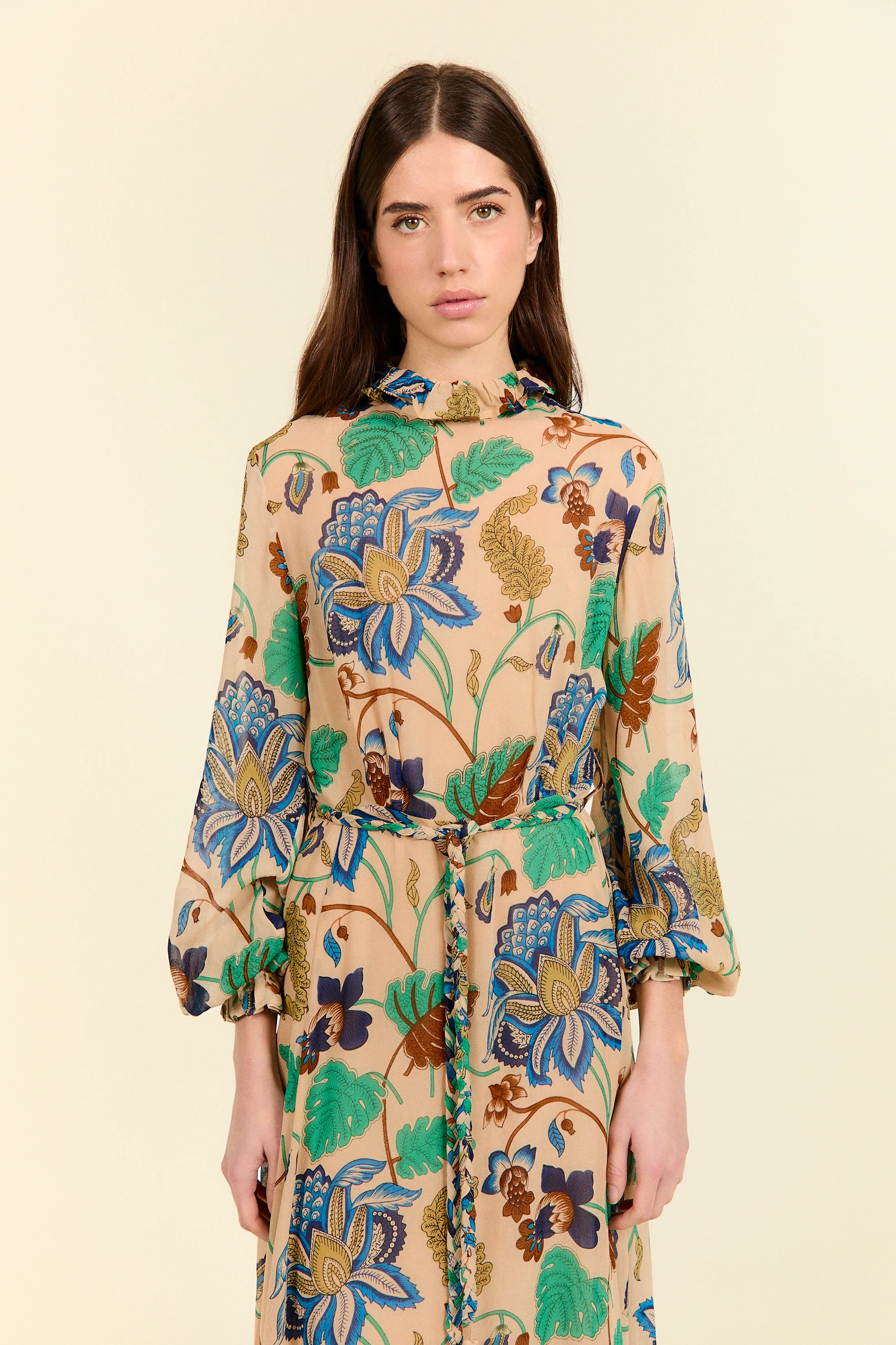 Vestido largo fluido en tejido viscosa, con estampado floral en tonos naturales y azules, cuello alto con volante y mangas largas abullonadas. Lleva cinturón a juego con borlas que estiliza la silueta. Elegante y bohemio, perfecto para un look sofisticado y atemporal.